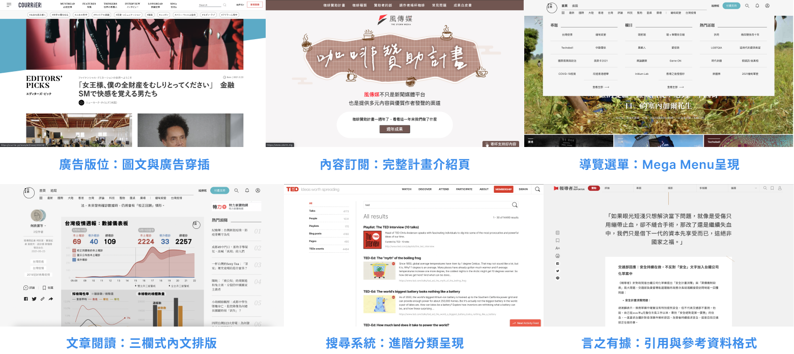為抓住報導型網站之設計趨勢,比對其他媒體平台,統整網站之設計要素。