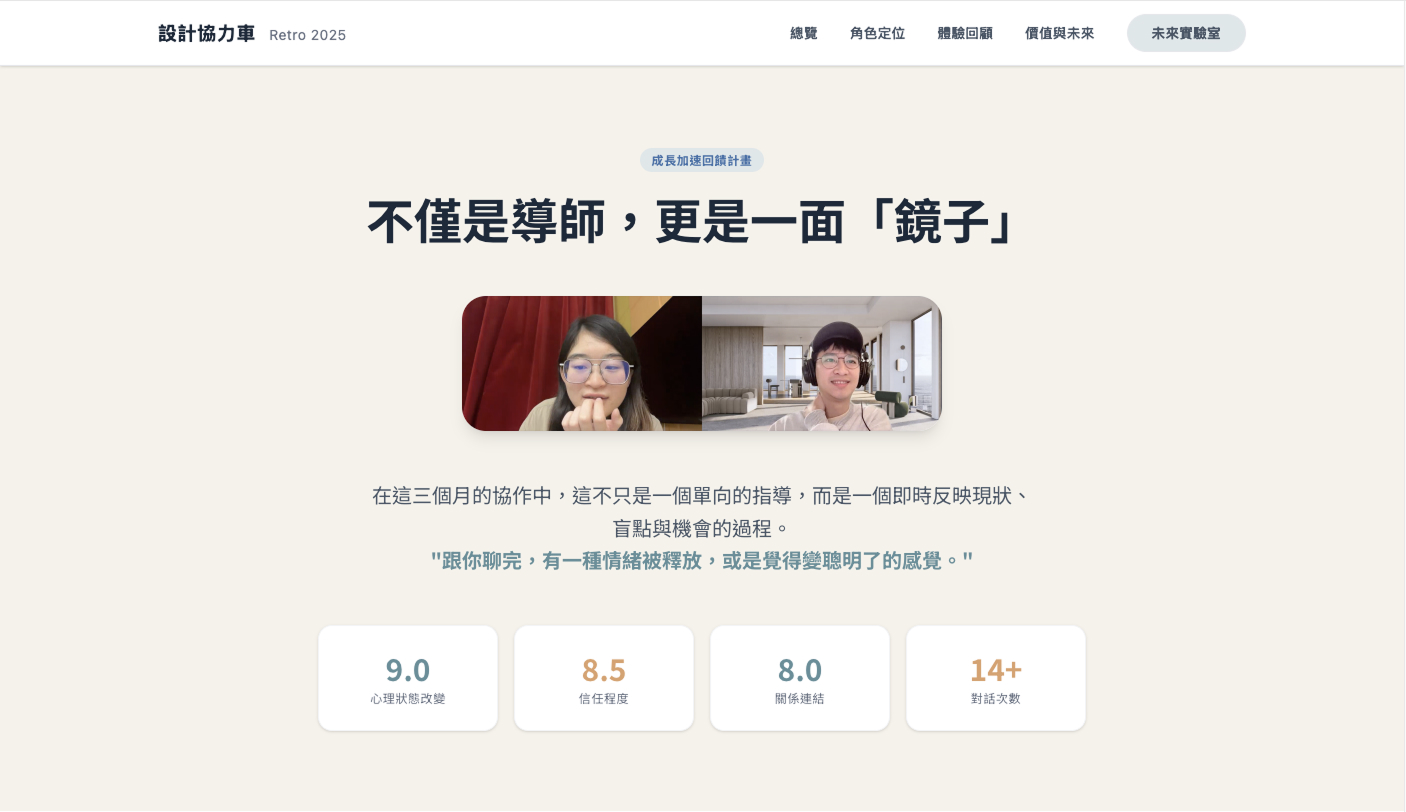 【設計協力車 - 成長回饋加速計劃】是一個自發性的 Mentoring 計畫,與好友 Valtina 進行設計職涯議題的各項對話,從 6 月非正式開始,持續超過半年,約 1 - 2 週進行一次的一對一深度對話。